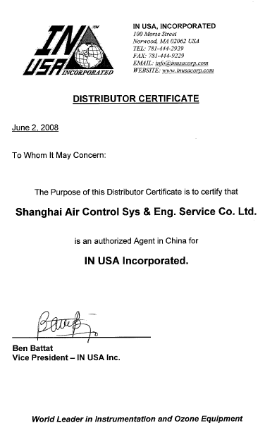 2005年3月美國IN USA公司的VP訪問我司,授權我司代理臭氧分析儀業務,公司成功將其產品推入環境監測、職業衛生和水處理等行業。
